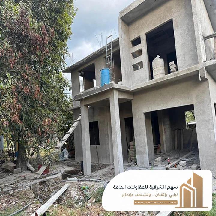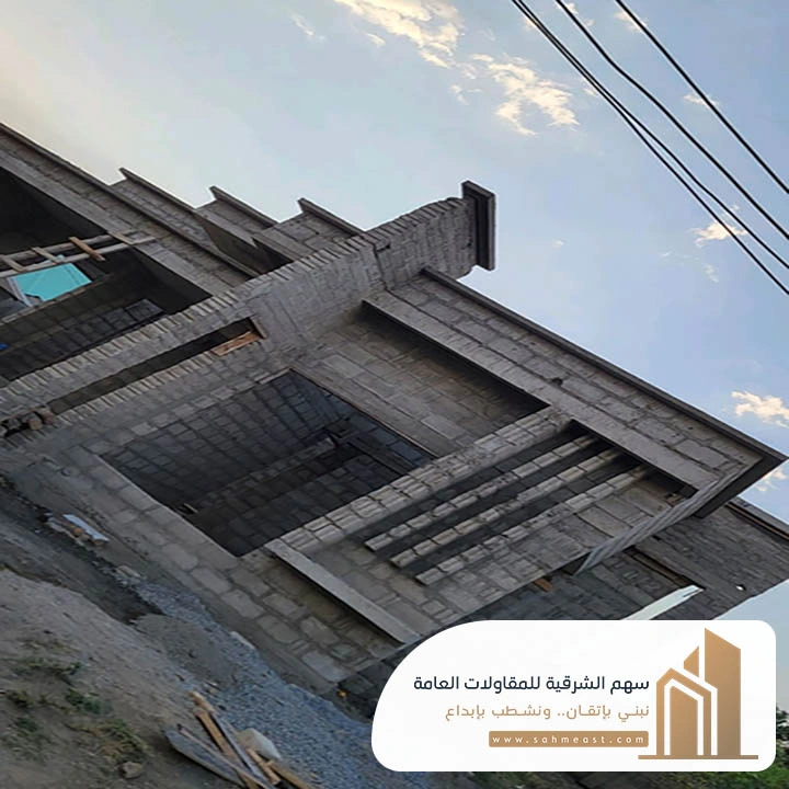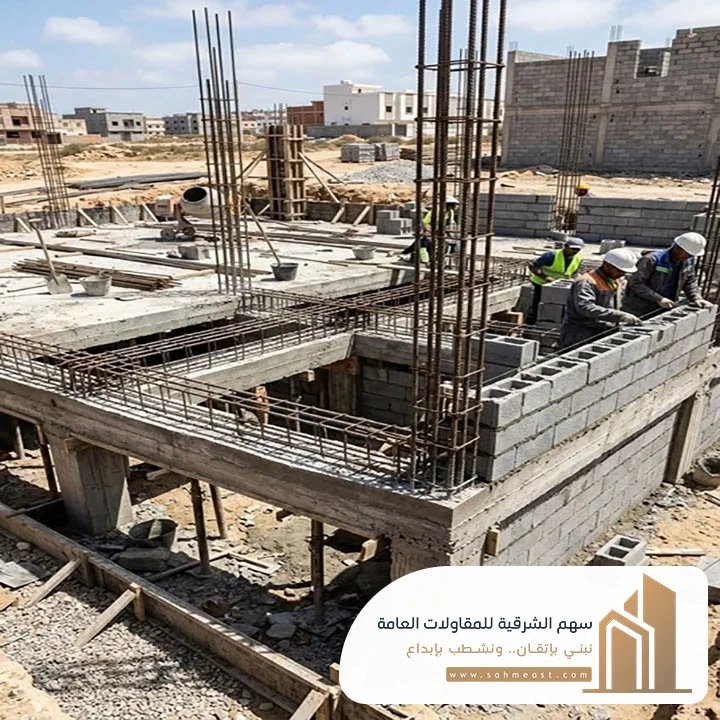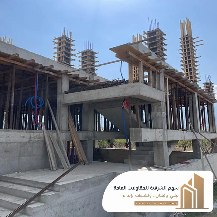 يتم صب الأعمدة ثم الأسقف باستخدام خرسانة مسلحة تضمن الصلابة والمتانة، مع الالتزام التام بالمقاييس الهندسية.